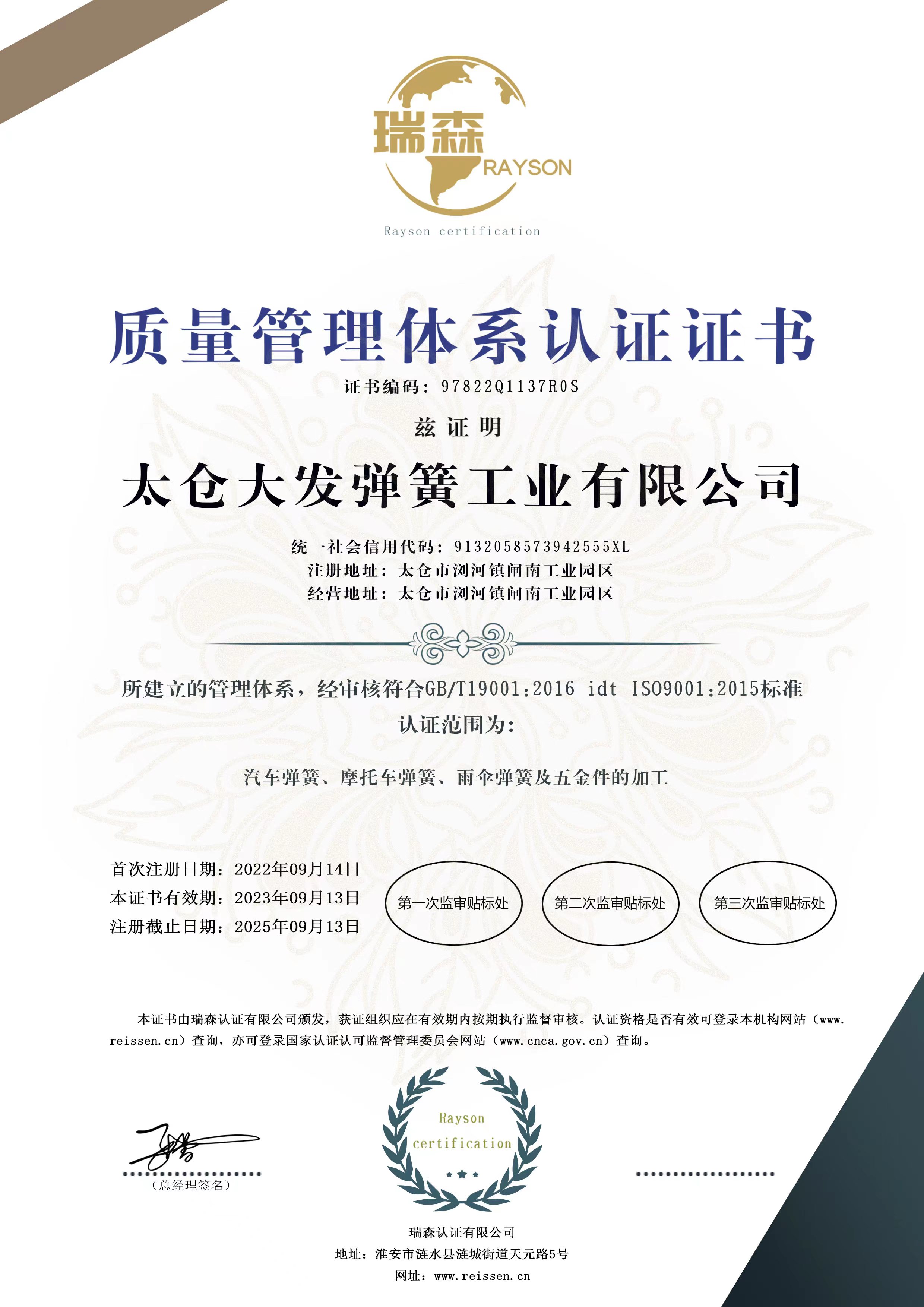 太倉大發(fā)彈簧工業有限公司由黃金樹先生于1967年始創(chuàng)于臺灣,是一個集雨傘、電子、五金機械、自行車、摩托車、汽車等的彈簧配件生產、加工、輔助設計服務的綜合性企業,其中1990年創(chuàng)辦的廈門大發(fā)彈簧公司、2000年創(chuàng)辦的深圳大發(fā)彈簧公司、2002年創(chuàng)辦的太倉大發(fā)彈簧公司均位于經濟發(fā)展地區,地理位置佳。我們憑借在彈簧制造業的多年豐富知識與技術,并著眼于以客戶為導向,秉持“以人為本,以質為先,以客為主,持續(xù)創(chuàng)新”的經營理念,強化競爭優(yōu)勢。公司導入ISO9001: 2000質量管理體系,執(zhí)行ISO14000:2000管理方式,倡導安全、高質量、高素質的生產。